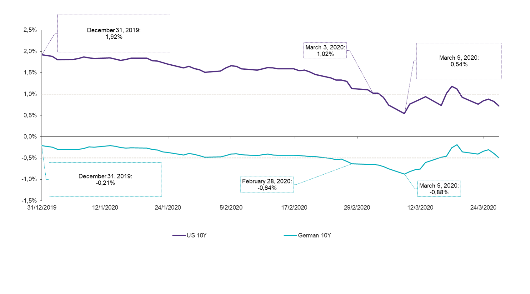 In the midst of the imminent crisis, investors seem to have turned their focus on low risk securities, increasing the demand for government bonds and pushing the respective yields downwards. Specifically, after the first emergency cut rate by the FED on March 3, US 10 Year Treasury rate reached an all time low of 0,54%, on March 9. This is considered a significant decline, when the respective rate stood at 1,92% on December 31. At the same time, the German 10 Year government bond yield is tracking the US Treasury rate, extending its fall up to 67 bps lower than the respective yield on December 31.