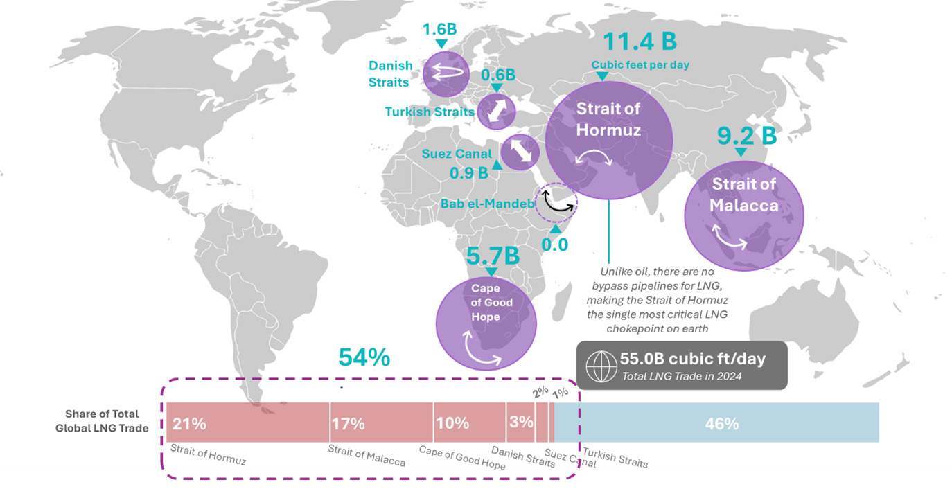 Figure 2 illustrates the primary chokepoints for global LNG shipments, showing both volume and geographic concentration. It demonstrates how LNG trade - like oil - relies on a limited number of strategic corridors, making the gas market similarly exposed to geopolitical or physical disruptions.