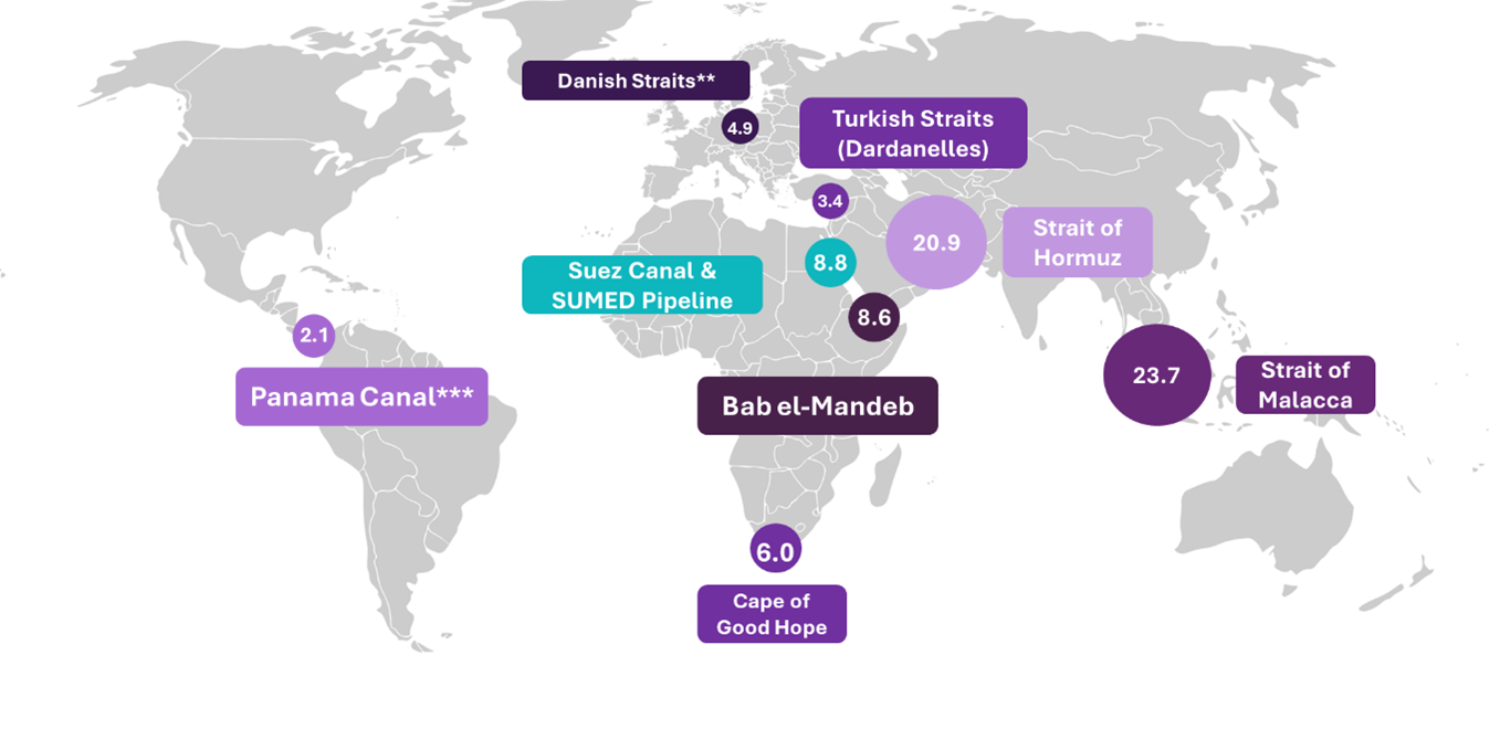 Figure 1: Volume of crude oil and petroleum liquids transported through world chokepoints* in 2023 (million barrels per day), source – source: EIA