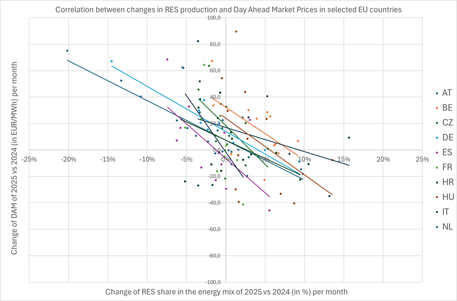 The role of RES in decreasing energy prices can be easily showcased by empirical data. The figure below illustrates the correlation between monthly changes in RES share in the generation mix and corresponding changes in day-ahead electricity market prices across selected European countries. Each point represents a monthly observation (Δ in RES share in the generation mix of 2025 vs 2024 and prices respectively), while the straight lines indicate country-level trends (linear).