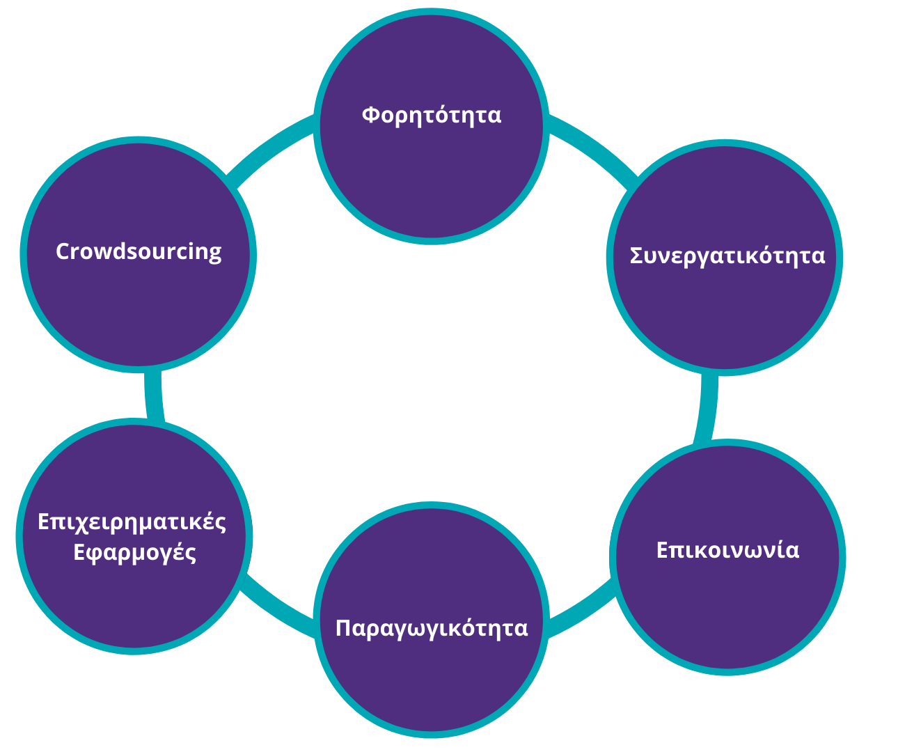 - Ψηφιακή ταυτοποίηση, Home Office 365, Φορητοί Σταθμοί Εργασίας, Έξυπνες Συσκευές, εύρος ζώνης δικτύου και ασφαλής πρόσβαση - Συνεργατικότητα: Βελτίωση της ικανότητας των εργαζομένων να συνεργάζονται