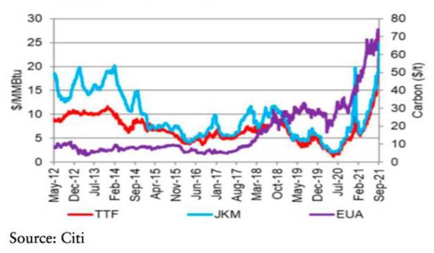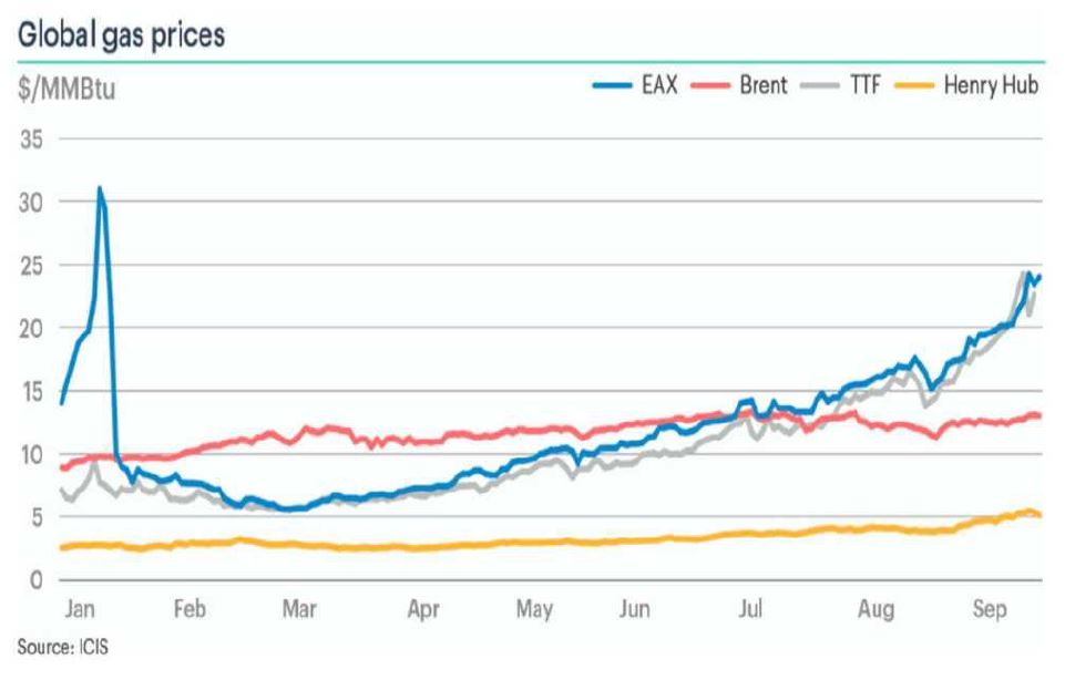 Ας δούμε καταρχάς συνοπτικά τις βασικές τιμές πετρελαίου και φυσικού αερίου (Φ.Α.) το 2021 (Διάγραμμα 1 κατωτέρω). Ένας κρύος χειμώνας στο βόρειο ημισφαίριο το 2020/21 έστειλε τις τιμές spot LNG στην Ασία σε επίπεδα ρεκόρ (EAX στο διάγραμμα), αλλά με την άφιξη θερμότερου καιρού, η τιμή αυτή μειώθηκε ραγδαία και η κανονική έκπτωση στο αργό πετρέλαιο, σε ενεργειακή βάση, αποκαταστάθηκε. Ωστόσο, κάτω από την επιφάνεια παραμόνευε μια βασική ανησυχία - σε όλες τις μεγάλες αγορές, ο κρύος χειμώνας είχε εξαντλήσει τα αποθέματα Φ.Α. Καθώς οι παράγοντες της αγοράς άρχισαν να επικεντρώνονται στα επίπεδα αποθεμάτων, οι τιμές του spot Φ.Α άρχισαν να αυξάνονται κατά την περίοδο της άνοιξης, όταν είναι συνήθως ήπιες. Εν τω μεταξύ, οι ελλείψεις στην παραγωγή ενέργειας από ανανεώσιμες πηγές στην Ευρώπη (παρατεταμένη περίοδος χαμηλής ταχύτητας ανέμου), αύξησαν τη ζήτηση Φ.Α στην παραγωγή ηλεκτρικής ενέργειας, αυξάνοντας την ανοδική πίεση στις τιμές. Οι Ευρωπαίοι ήθελαν να αγοράσουν επιπλέον LNG για να αρχίσουν να ''ανοικοδομούν'' τα αποθέματα, αλλά οι Ασιάτες αγοραστές ήταν πιο επιθετικοί με την άμεση αγορά LNG στην Ασία να προσελκύει τα περισσότερα φορτία. Το αποτέλεσμα ήταν μια έκρηξη στις τιμές spot. Από τις αρχές Οκτωβρίου 2021, το TTF (ο πλέον ρευστός δείκτης τιμών Φ.Α. στην Ευρώπη) και οι τιμές spot Φ.Α της Ανατολικής Ασίας (ΕΑΧ) έχουν υπερβεί τα $35/mmBtu, δηλαδή διπλάσιο πετρέλαιο Brent σε ενεργειακή βάση. Αντίθετα, οι τιμές TTF ήταν κατά μέσο όρο $6,60 δολάρια για την περίοδο 2011-2020, σύμφωνα με τη Στατιστική Επιθεώρηση της BP «World Energy 2021». Το παρακάτω διάγραμμα 1 αποτυπώνει την εξέλιξη τιμών πετρελαίου και Φ.Α. το 2021 μέχρι τα τέλη Σεπτεμβρίου, οπότε και οι τιμές Φ.Α. διαπερνούσαν το φράγμα των $25/mmBtu.