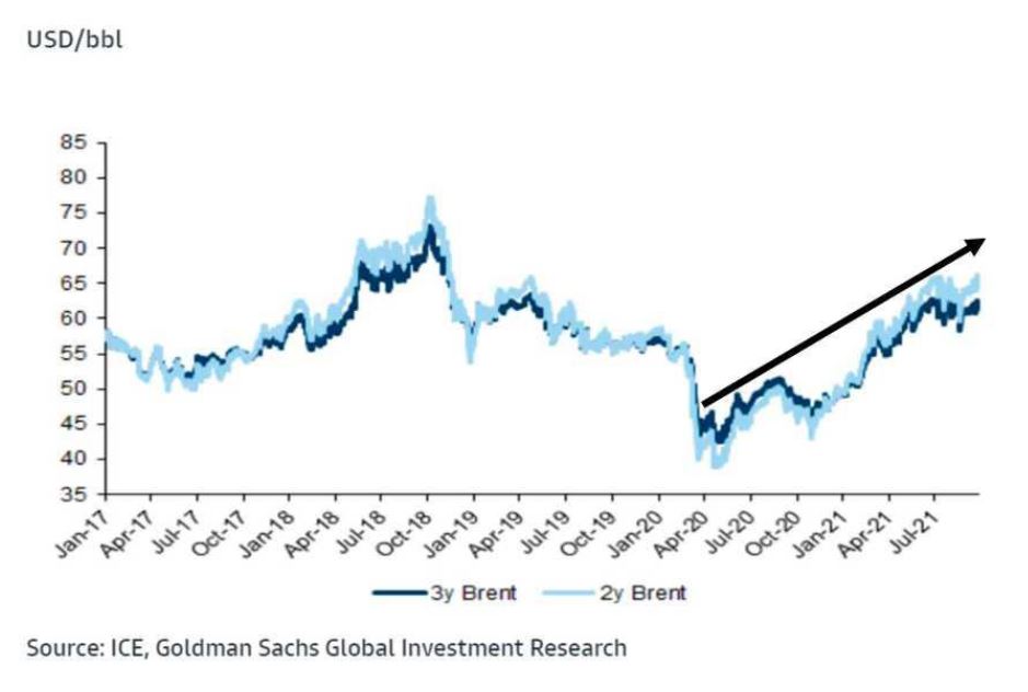 Αυτή η αντίληψη όμως φαίνεται να αλλάζει πολύ γρήγορα. Το Brent του «μπροστινού μήνα» (front-month) έχει υπερβεί τα $80/bbl. η αγορά επανεκτιμά τη ζήτηση (πιο ισχυρή από ό,τι νομίζαμε, ιδίως στην Ασία), τα αποθέματα (πιο εξαντλημένα από ό,τι νομίζαμε, ιδίως στις αναδυόμενες αγορές) και την προσφορά (πιο ακριβή στο margin και πέρα από την ικανότητα του ΟΠΕΚ να το επιλύσει μόνη της). Οι προθεσμιακές αγορές παραμένουν σε οπισθοδρόμηση “backwardation”, επομένως δεν βρισκόμαστε σε πλήρη στενότητα της αγοράς για βαρέλια άμεσης παράδοσης, αλλά η καμπύλη ισοπεδώνεται καθώς αυξάνονται οι τιμές του Brent που χρονολογούνται μέσο-μακροπρόθεσμα (long dated). Περαιτέρω αυξήσεις των τιμών του «μπροστινού μήνα» και των μακροπρόθεσμων τιμών θα πρέπει να αναμένονται.