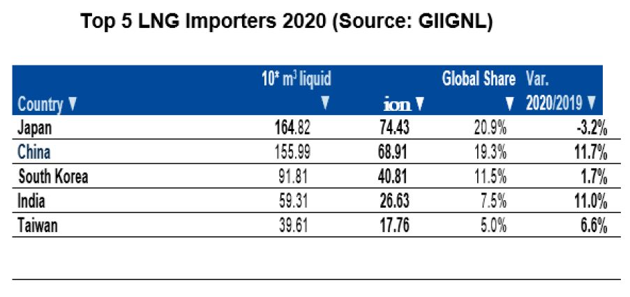 Η Κίνα, εν τω μεταξύ, είναι πλέον ο μεγαλύτερος αγοραστής LNG στον κόσμο - θα ξεπεράσει την Ιαπωνία το 2021 για την πρώτη θέση (Διάγραμμα 3). Και η Κίνα χρειάζεται φυσικό αέριο - οι Κινέζοι αγοραστές LNG είναι κυρίως υπεύθυνοι για την ανύψωση των τιμών spot Φ.Α. της Ανατολικής Ασίας (δείκτης ΕΑΧ) σε πάνω από $30/mmBtu, καθώς προσπαθούν να πραγματοποιήσουν αποθέματα για τον επερχόμενο χειμώνα για να καλύψουν τη θέρμανση χώρων και τη βιομηχανική ζήτηση. Αυτή τη στιγμή όλοι οι αγοραστές LNG με μακροπρόθεσμες συμφωνίες αγοράς μεγιστοποιούν τις λήψεις στο πλαίσιο αυτών των συμβάσεων και έτσι πληρώνουν τιμές που είναι συχνά λιγότεροαπό το ήμισυ του επιπέδου των τιμών spot - η πραγματικότητα είναι ότι τα παγκόσμια αποθέματα φυσικού αερίου είναι αρκετά χαμηλά και ο πανικός στις αγορές οδηγεί τις τιμές spot αυτή τη στιγμή (η προσδοκία είναι βέβαια ότι μόλις οι αγοραστές αποφασίσουν ότι έχουν κλείσει τους όγκους που χρειάζονται για το χειμώνα, οι τιμές θα μπορούσαν να καταρρεύσουν, απουσία κρύου καιρού).