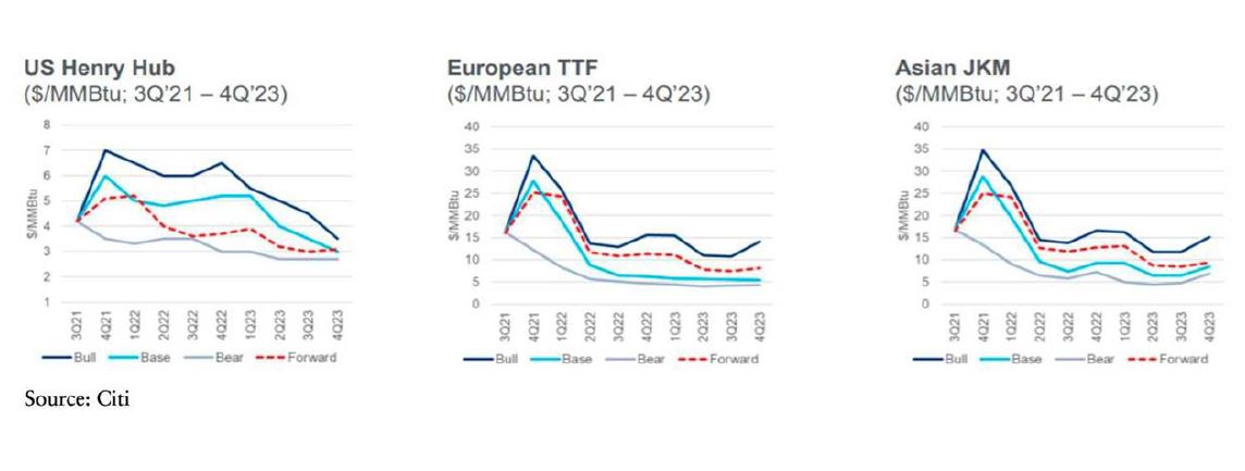 Οι προθεσμιακές αγορές σηματοδοτούν σαφώς κάπως υψηλότερες τιμές πετρελαίου. Οι τιμές του άνθρακα θα μπορούσαν να παραμείνουν αυξημένες, αλλά υπάρχουν πιέσεις πολιτικής και αγοράς που θα μπορούσαν να μειώσουν τη ζήτηση με την πάροδο του χρόνου, ακόμη και με την προσφορά να παραμένει σχετικά περιορισμένη, επειδή όπως προαναφέραμε οι μακροπρόθεσμες επενδύσεις σε νέα ανθρακωρυχεία θα παραμείνουν επικίνδυνες. Τι γίνεται με το αέριο? Οι αγορές συμβολαίων μελλοντικής εκπλήρωσης αναμένουν κάποια ομαλοποίηση από την άνοιξη του 2022 - μια επιστροφή σε πιο φυσιολογικά εποχιακά επίπεδα τιμών και λιγότερη μεταβλητότητα, καθώς και επιστροφή σε μια διαρθρωτική διαφορά μεταξύ του ευρωπαϊκού TTF και του (υψηλότερου) Ασιατικού δείκτη. Αλλά υπάρχουν πολλές μεταβλητές «μπαλαντέρ» όπως φαίνεται και στις εκτιμήσεις της Citi (Διάγραμμα 5).