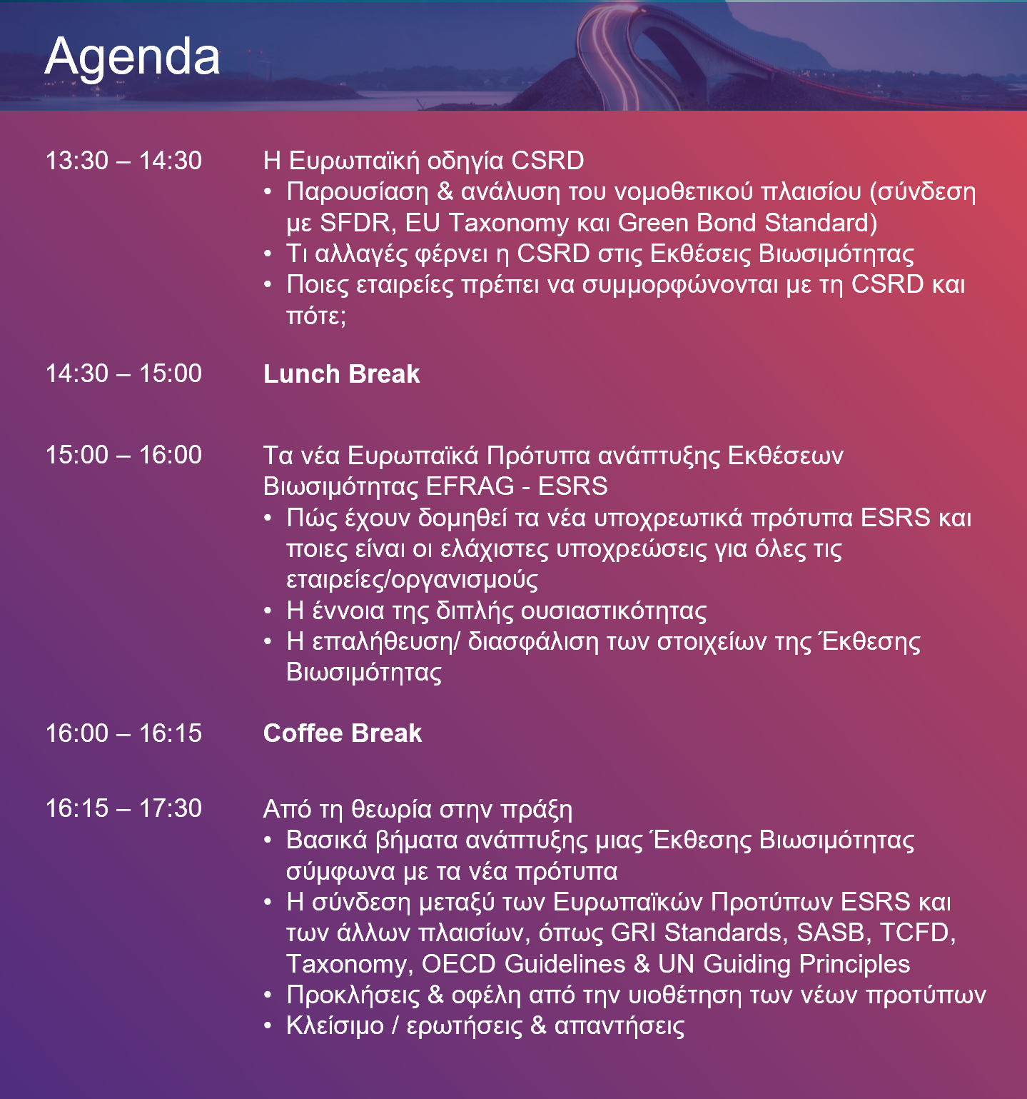 Τέλος, θα αναλυθούν και τα βασικά βήματα για την ανάπτυξη μιας Έκθεσης Βιωσιμότητας σύμφωνα με τα νέα ευρωπαϊκά πρότυπα.