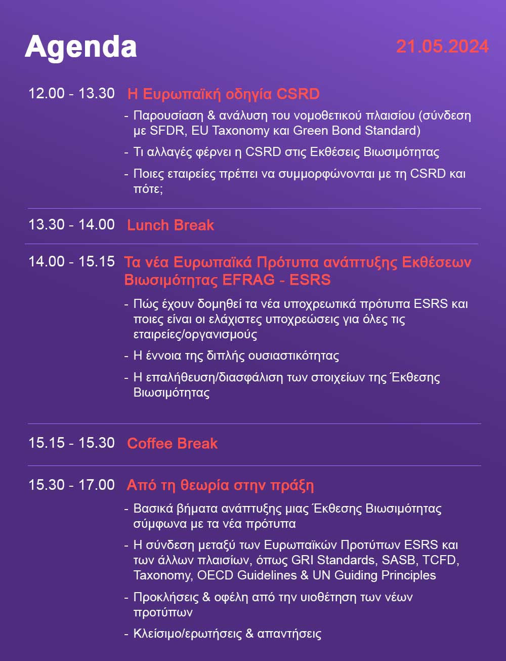 Τέλος, θα αναλυθούν και τα βασικά βήματα για την ανάπτυξη μιας Έκθεσης Βιωσιμότητας σύμφωνα με τα νέα ευρωπαϊκά πρότυπα.